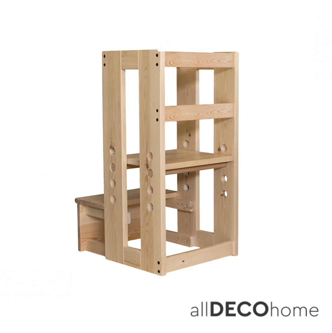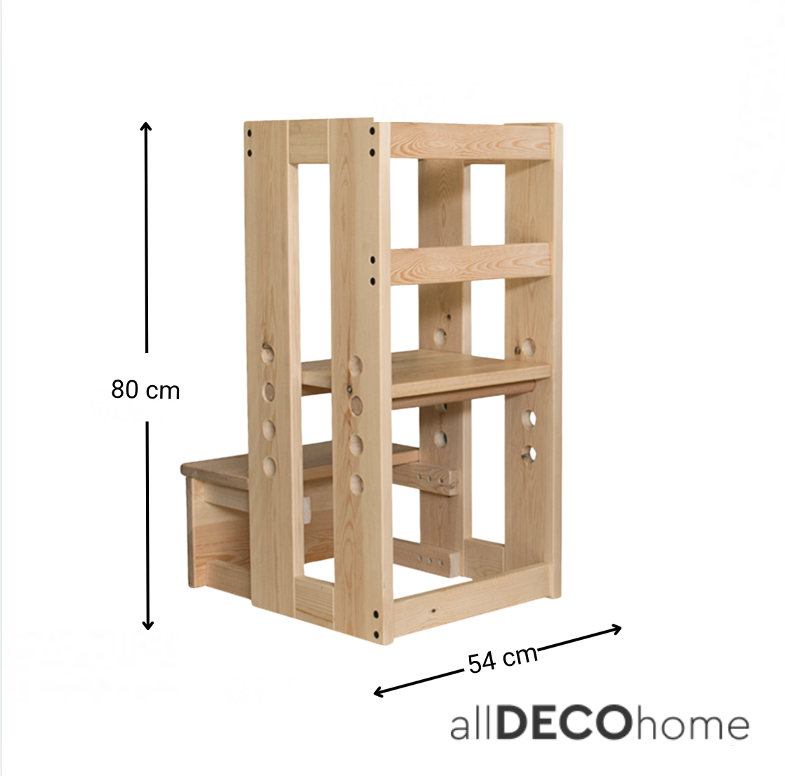 Use: The learning tower is designed according to the principles of Montessori furniture. It consists of a fixed stair and an adjustable one in 4 levels, so that it is adjusted according to the height and development of the child. The height of the platform is easily adjusted. The corners of the furniture are rounded for greater safety. It is designed so that it is beautiful in the house and occupies the smallest possible space. Natural materials have a smooth finish and provide ease of cleaning.