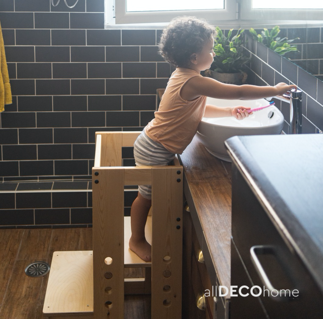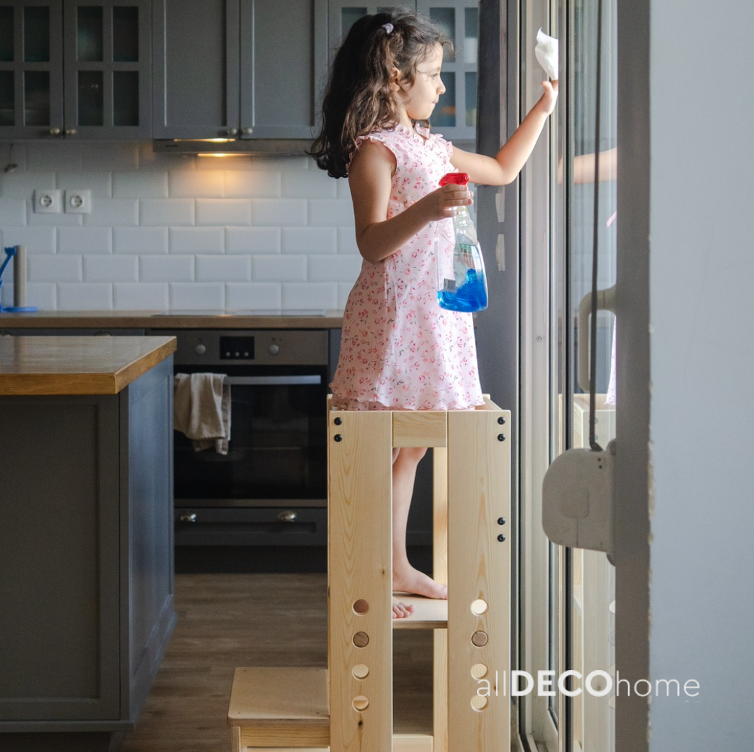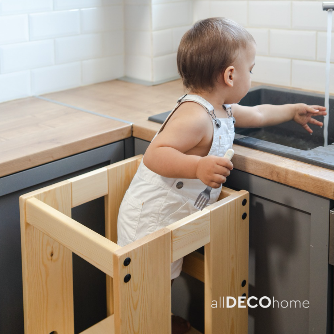 The Learning Tower is an excellent tool that helps the child to participate in the daily tasks of the house. With the learning tower, the educational process becomes easy, as it gives the necessary height for the child to participate in the tasks and interact with the adults. The aim is to develop his skills in subjects such as cooking, washing dishes, gardening, manual work, etc. The children also learn how to serve themselves as - by imitation of the parent - they learn to wash their hands, put on water, or brush their teeth. With the learning tower the child learns from infancy to be independent and autonomous. It acquires initiatives early, resulting in the enhancement of self-confidence and evolutionary course.